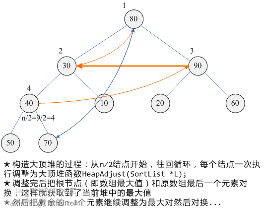 - ① 循环处理元素构造大顶堆