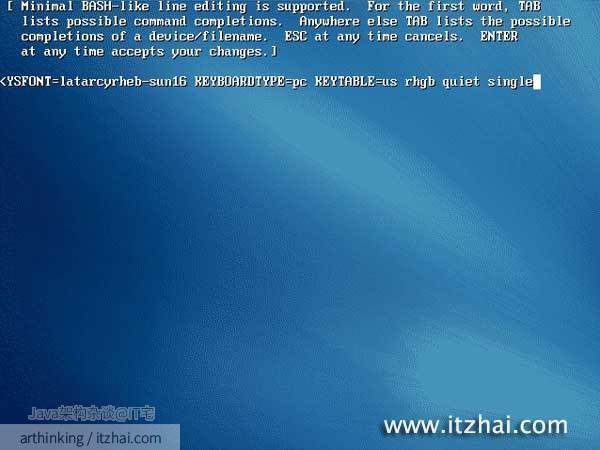 [/caption] 三、按上下方向键移动到kernel…项,按”e”,接下来出现如下界面,输入” single”(空格single): [caption id=“attachment_302” align=“aligncenter” width=“300” caption=“Fedora忘记密码的解决办法”]