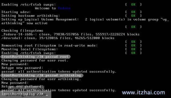 [/caption] 四、接着返回第二个界面,直接按”b”启动,这样系统就进入了单用户模式,接下来是一系列的系统引导信息的提示,在启动完成之后就可以重设密码了,这里把root用户和选一个其他的用户重设密码(这里选本机中的arthinking用户),如图: [caption id=“attachment_303” align=“aligncenter” width=“300” caption=“Fedora忘记密码的解决办法”]