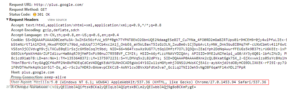 如上图所示,请求 google plus 请求头就包含了用户的浏览器信息: