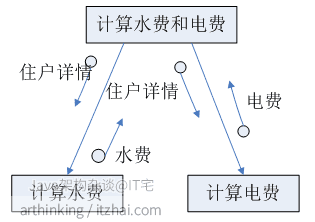 “住户情况”是一个数据结构,图中模块都与此数据结构有关。“计算水费”和“计算电费”本无关,由于引用了此数据结构产生依赖关系,它们之间也是标记偶合。