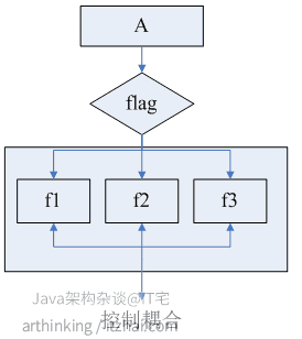 (4) 控制耦合–模块A通过传送开关、标志、名字等控制信息,明显地控制选择模块B的功能,例如下图