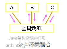 (6) 公共环境耦合—例如,如下图,模块A、B、C共享全局变量数组