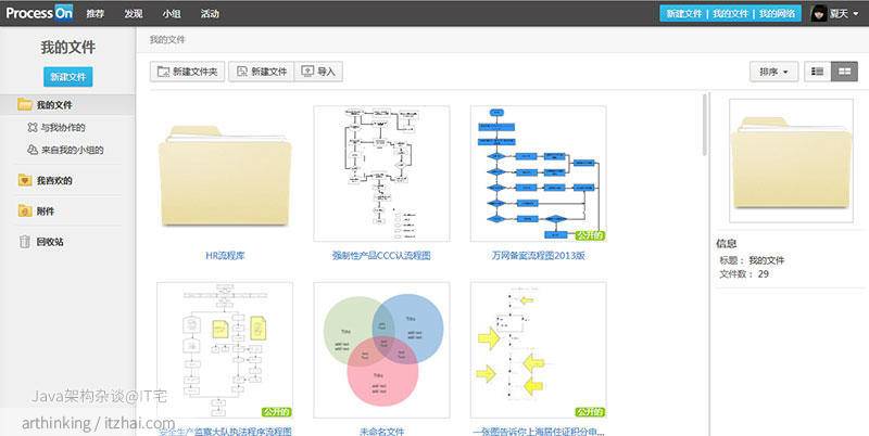 ProcessOn在个人文件管理这块做的很不错,提供功能丰富的文件管理, 可以随时对文件进行查看、修改、复制、删除、移动等等操作。这一切都是在线上完成,非常方便,这一点也很符合现在数据云存储、云管理等大的发展趋势。